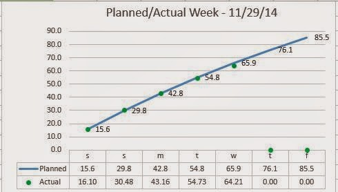 This line graph show the week to date goal for each day of the week. The green dots show the actual miles walked.